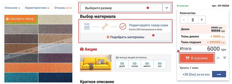 - На странице товара выберите размер и необходимые параметры товара(цвет, тип, оформление), укажите желаемое количество;
