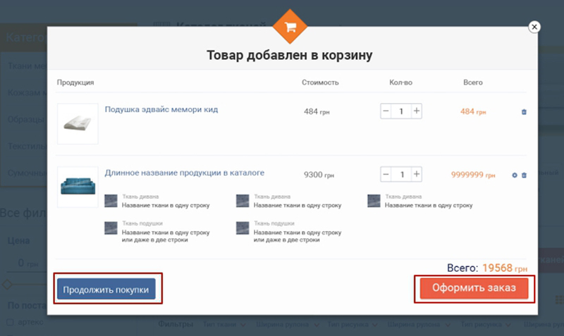 - После того как выбрали параметры товара нажмите кнопку "В корзину" на экране отобразиться промежуточное окно. Если вы желаете продолжить покупки и добавить еще какие-то товары к заказу - нажмите кнопку "Продолжить покупки". Если же Вы желаете перейти к оформлению заказа - нажмите "Оформить заказ"