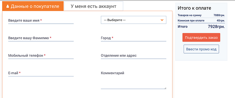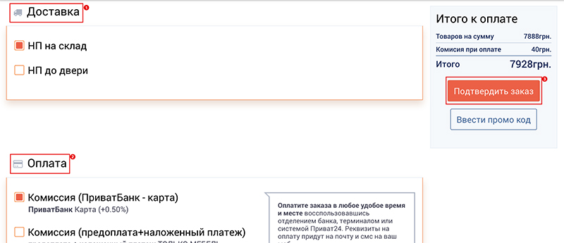 Если у Вы уже зарегистрировались на нашем сайте и у вас есть аккаунт - войдите в него. Все поля заполняться автоматически. - Укажите удобные для вас метод доставки и способ оплаты. После нажмите кнопку "Подтвердить заказ". Обратите внимание Вы можете произвести оплату онлайн по помощи карт Visa или Mastercard, а также воспользовавшись клиент-банком, к примеру Приват24.